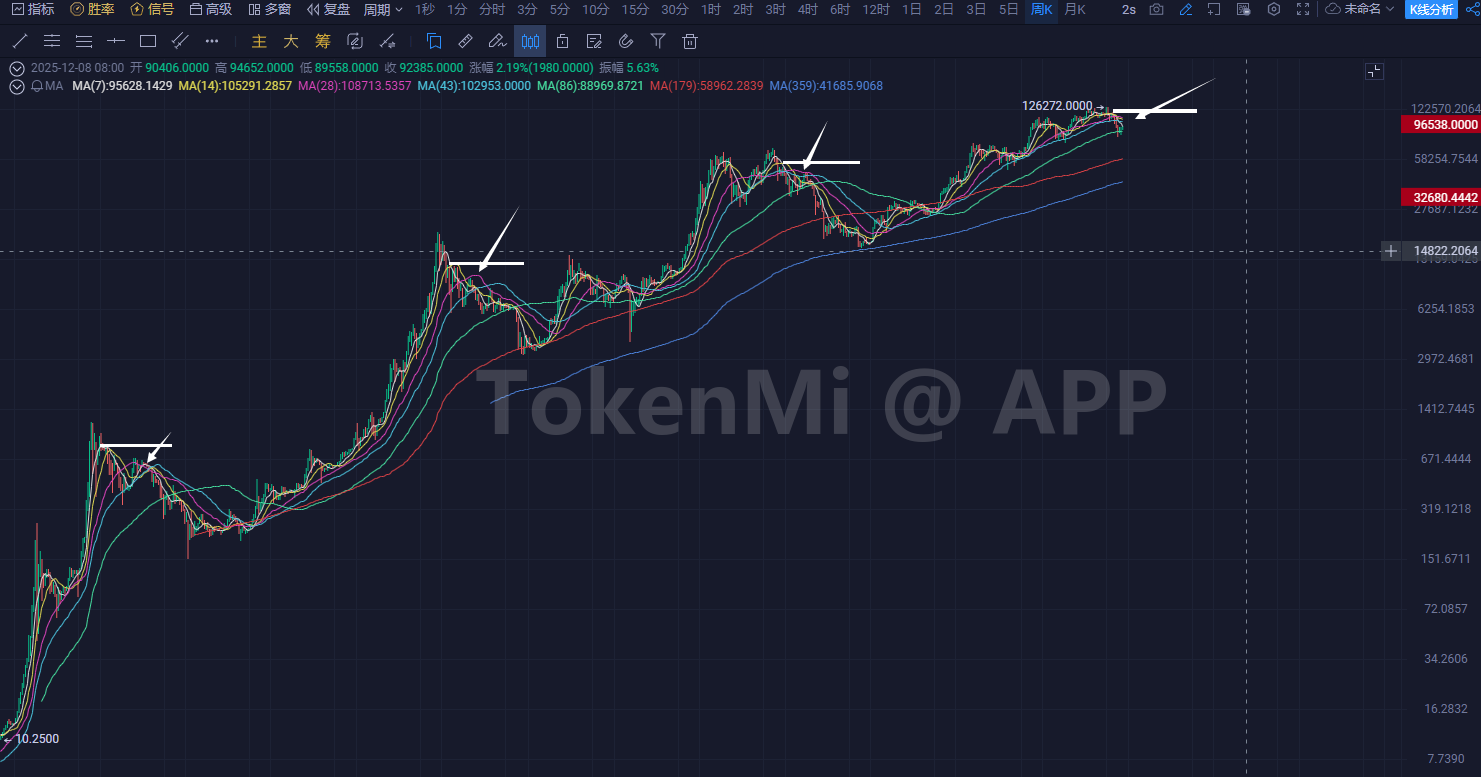 28周线死死压住,更别提突破次高点了,一次都没有,然后就熊了,而这里跌幅还不到腰斩,第一个条件就没有达成,第二个甚至都还没有基础,所以暂时不要那么悲观,行情一步一步走一步一步看,大方向上海没有熊,就不要按照熊市来了的方式操作。如果熊市来了简单计算,这里腰斩63000美金,反弹50%大约就是9万多,那么如果你觉得熊市概率高,你做跑路动作我没意见,因为当下位置就是熊了之后能反弹的上限所在,跑也无可厚非。但还是那句话,熊市还没有确定,没必要折腾对吧,实在确定了反弹回来再跑也差不了多少。为了那点可能性损失错失低成本筹码或者错过牛市,那才蛋疼对吧。