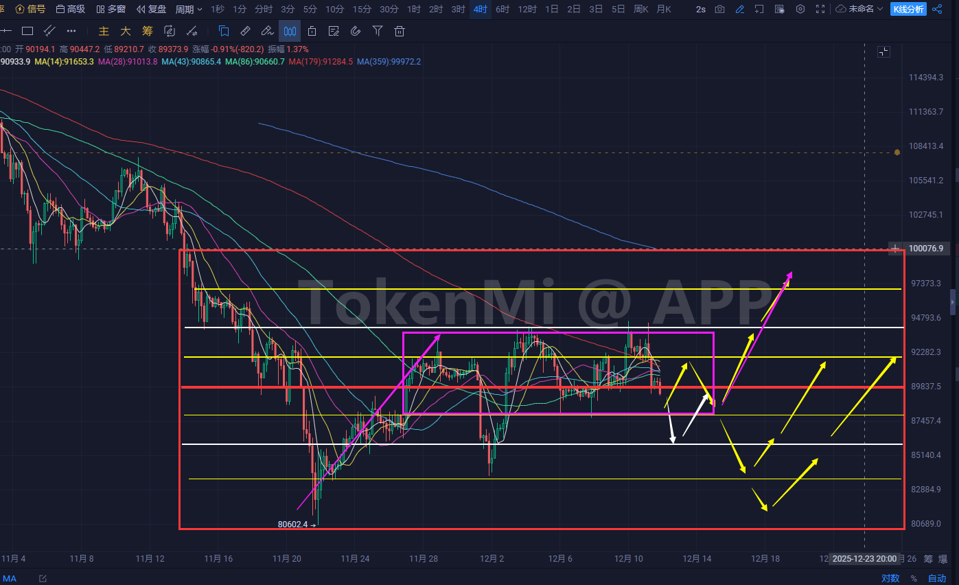 那么不好的方面就是,箱体这东西和双头头肩顶多重顶这些是可以有组合的,能做底部反弹,也可以做下降中继,就是看最后朝哪突破的问题。如果坏一点时间不是很紧,那就可以回踩更深一些。数字方面基本上是整数位以90为核心,上下2000美金递减或者递增,这个阶段完成后然后形成3K的递减或者递增。所以向上就是90-92-94-97,向下就是90-88-86-83,类似这种套路。又因为整个88-92都是中枢震荡范围,所以一旦价格进入这个区域就可能变成震荡,上涨下跌都变得不流畅。就会很难做。再叠加上以太的幺蛾子,更难做,所以基于这种不稳定形态,如果没有好的机会或者在相对高低位不敢做,你只要在中间做了,基本上都是来回绞杀,只有消耗,很难赚钱,所以面对这种局面,如果不好做,还不如不做,不亏就是赚。
